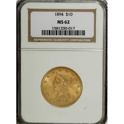 <B>1894 $10 MS62 NGC.</B></I> NGC Census: (9756/4281). PCGS Population (5273/1298). Mintage: 2,470,778. Numismedia Wsl. Price for NGC/PCGS coin in MS62: $395. (#8729)<BR><BR><B>Coin Engraver:</B> Christian Gobrecht<BR><BR><b>Shipping:</b> Coins & Currency (<a target="_blank" href="http://www.heritageauctions.com/common/shipping.php">view shipping information</a>)