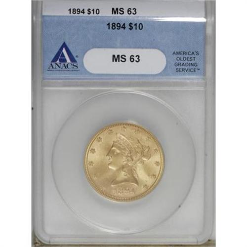 <B>1894 $10 MS63 ANACS.</B></I> . NGC Census: (4025/357). PCGS Population (1231/100). Mintage: 2,470,778. Numismedia Wsl. Price for NGC/PCGS coin in MS63: $1,220. (#8729)<BR><BR><B>Coin Engraver:</B> Christian Gobrecht<BR><BR><b>Shipping:</b> Coins & Currency (<a target="_blank" href="http://www.heritageauctions.com/common/shipping.php">view shipping information</a>)