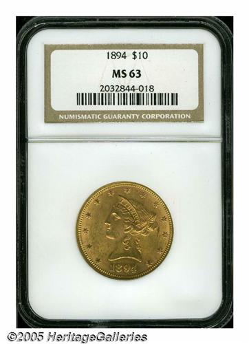 <B>1894<$10> MS63 NGC.</B></I> This coin displays honey-gold patina. Several miniscule contact marks on the motifs and in the fields, none of which are individually offensive, disturb somewhat the luster flow. The design elements are adequately struck, except for softness in most of the star centers.