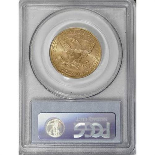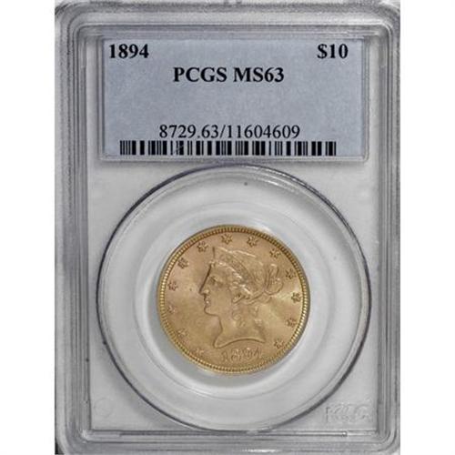 <B>1894 $10 MS63 PCGS.</B></I> This is an appealing Select Uncirculated representative with light straw-gold and pastel rose coloration and shimmering luster. The design elements are sharply struck and the number of surface blemishes seems consistent with the assigned grade level. <BR><BR><b>Shipping:</b> Coins & Currency (<a target="_blank" href="http://www.heritageauctions.com/common/shipping.php">view shipping information</a>)