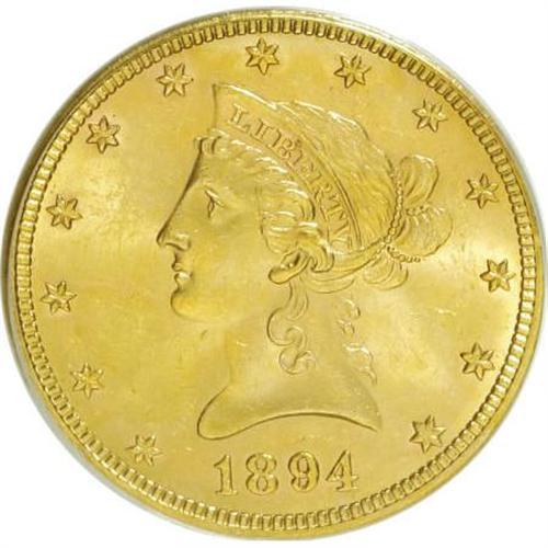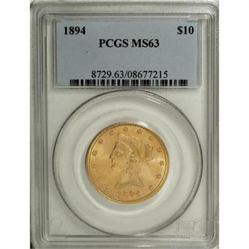 <B>1894 $10 MS63 PCGS.</B></I> . PCGS Population (1223/100). NGC Census: (4019/357). Mintage: 2,470,778. Numismedia Wsl. Price for NGC/PCGS coin in MS63: $1,220. (#8729)<BR><BR><B>Coin Engraver:</B> Christian Gobrecht<BR><BR><b>Shipping:</b> Coins & Currency (<a target="_blank" href="http://www.heritageauctions.com/common/shipping.php">view shipping information</a>)