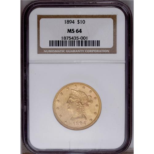 <B>1894 $10 MS64 NGC.</B></I> A lustrous and carefully preserved type coin from the second Grover Cleveland Administration. Boldly struck save for the claws and a couple of star centers. Small marks behind the eye and between the lower arrowheads are barely worthy of mention.
