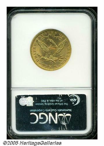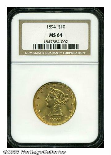 <B>1894<$10> MS64 NGC.</B></I> The 1894 is available through Near Gem, but becomes very scarce in Full Gem and above. Indeed, NGC has certified only nine coins higher, and PCGS has seen none higher. Satiny luster bathes each side, and is overlain by yellow-gold patina. There are fewer marks than what might be expected for the grade level.