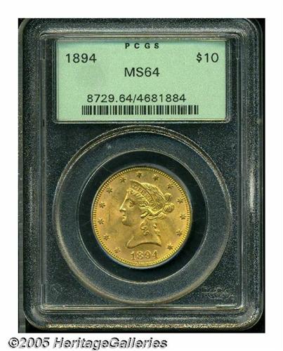 <B>1894<$10> MS64 PCGS.</B></I> A lustrous honey-gold near-Gem, sharply struck and encapsulated in an old green holder. None have been certified finer by PCGS.