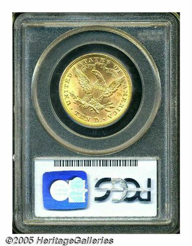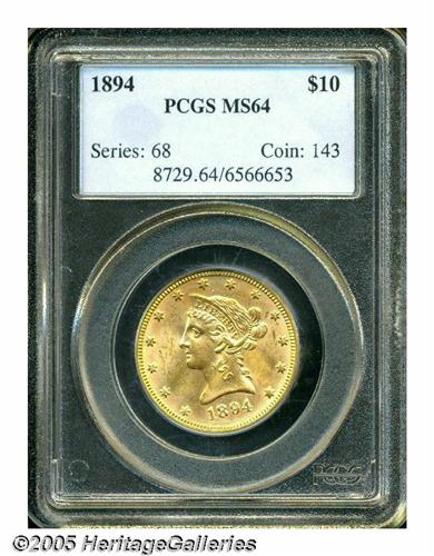 <B>1894<$10> MS64 PCGS.</B></I> Lovely orange surfaces alternating with deeper golden hues. A couple of faint luster grazes detract from the otherwise even and smooth surfaces. Population: 85 in 64, none finer (6/05).
