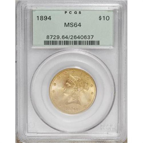 <B>1894 $10 MS64 PCGS.</B></I> Well struck and lustrous, with relatively clean fields and lovely peach-gold coloration. A few too many abrasions on Liberty's face limit the grade. Although the 1894 eagle has one of the highest mintages of the series, the issue tends to come bagmarked, and near-Gems are relatively scarce. PCGS has graded no example higher than this one (11/07). <BR><BR><B>Coin Engraver:</B> Christian Gobrecht<BR><BR><b>Shipping:</b> Coins & Currency (<a target="_blank" href="http://www.heritageauctions.com/common/shipping.php">view shipping information</a>)