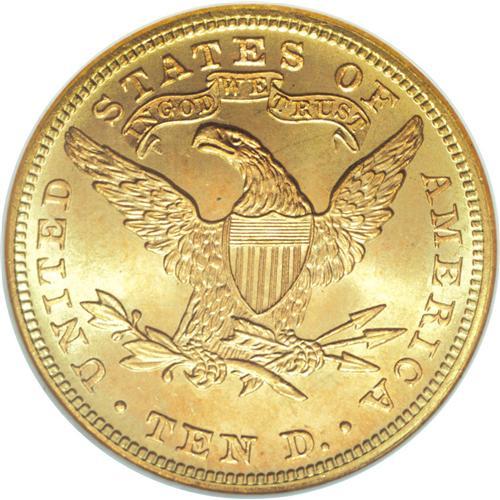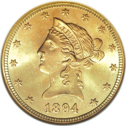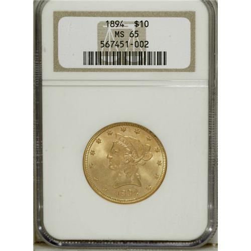 <B>1894 $10 MS65 NGC.</B></I> A subtly lustrous yellow-orange representative that exhibits crisp detail and excellent overall eye appeal. The reverse is clean, and only a few superficial grazes appear on the obverse portrait. A wonderful representative for the date or 19th century type collector. Census: 11 in 65, 0 finer (4/07).<BR><BR><b>Shipping:</b> Coins & Currency (<a target="_blank" href="http://www.heritageauctions.com/common/shipping.php">view shipping information</a>)