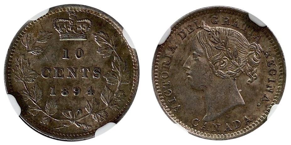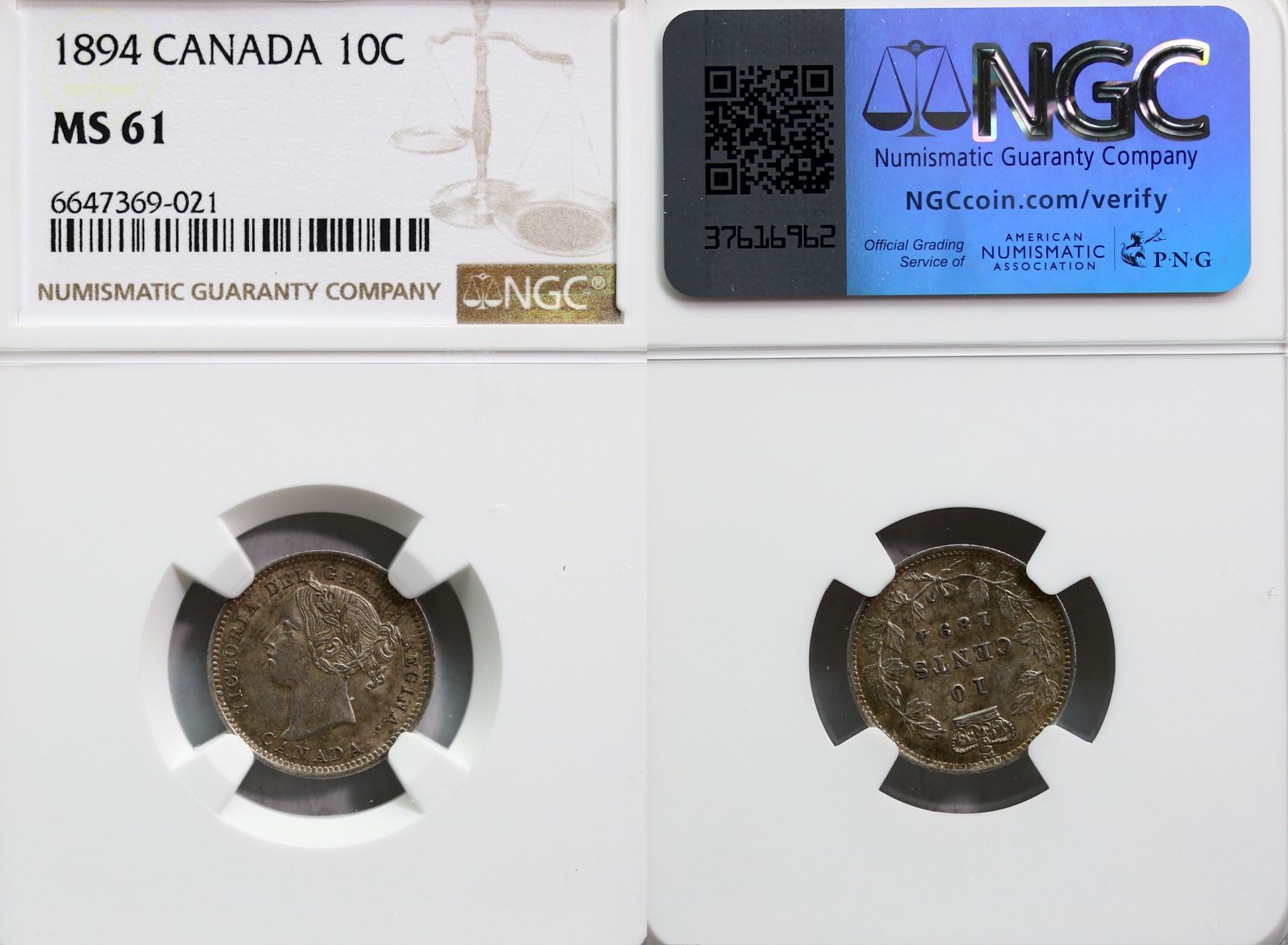 1894 10¢ NGC Mint State-61. A beautiful and original coin with good lustre throuhout.