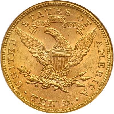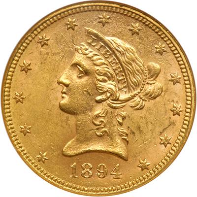 1894 $10. NGC graded MS-62. Lightly toned with plenty of mint bloom in the protected areas.