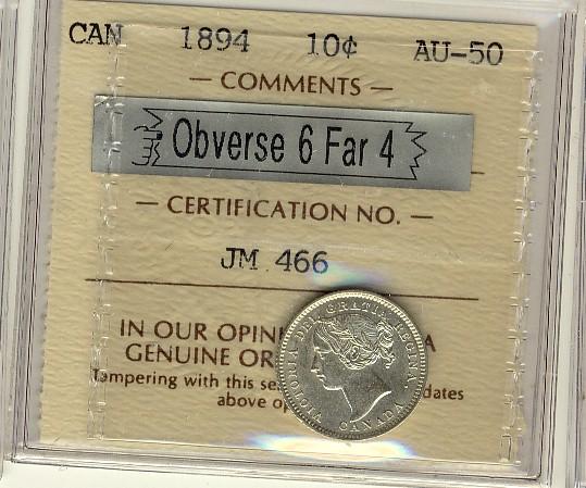 1894 10¢ Obv 6 Far 4 ICCS AU50