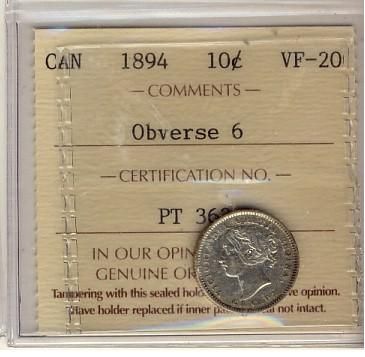 1894 10¢ Obv 6 ICCS VF20.