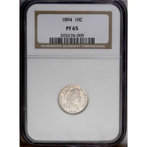<B>1894<10C> PR65 NGC.</B></I> Sharply struck with watery pale-green fields that show a faint degree of milkiness on each side and hairline-free surfaces that also seem devoid of bothersome handling marks. A pair of tiny planchet flaws are noted on Liberty's cheekbone, while a third, slightly larger planchet depression rests just below Liberty's eye. A minute toning fleck rests just above the truncation of Liberty's bust.
