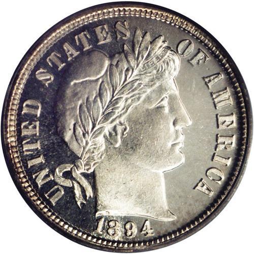 <B>1894<10C> PR66 Cameo PCGS.</B></I> A glittering-white proof representative with appealing contrast between the glassy field and the chalky central devices. Little more could be asked of this well produced, Superb cameo. Population: 9 in 66, 3 finer (4/06).