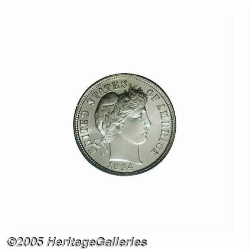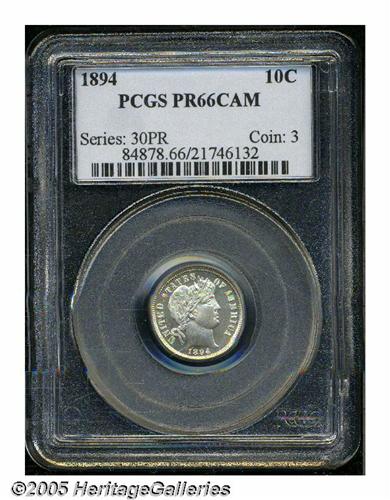 <B>1894<10C> PR66 Cameo PCGS.</B></I> Untoned with needle sharp, modestly frosted devices and illimitable depth of reflectivity in the fields. Outstanding quality, even for this well produced early Barber proof. Population: 9 in 66 Cameo, 3 finer (6/05).