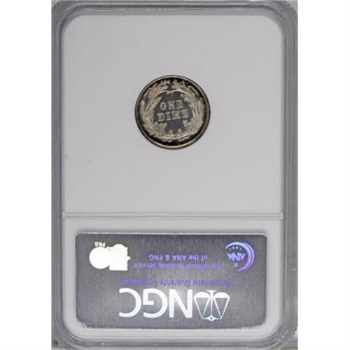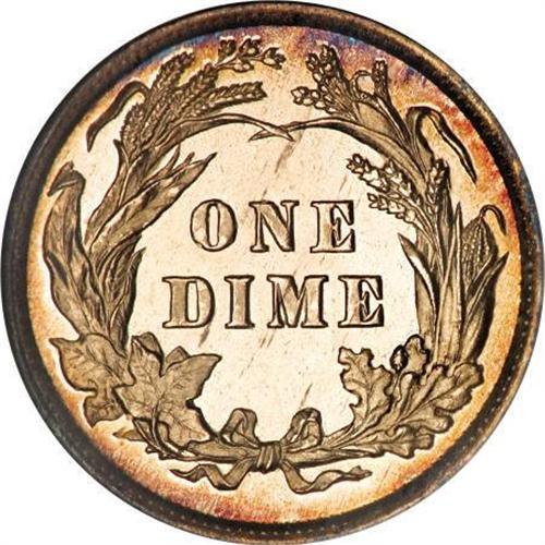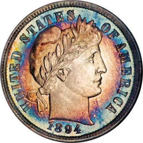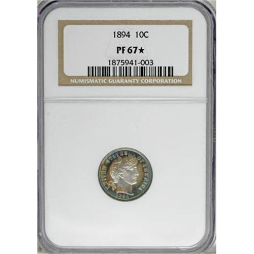<B>1894 10C PR67 <img src="/images/star.gif" width="10" height="10" alt="" border="0"> NGC.</B></I> It is not difficult to see why NGC assigned the Star classification to this Superb Gem proof. Thick frost is seen on the design elements, that yield noticeable contrast with the reflective fields, perhaps slightly more on the reverse. Cobalt-blue and purple toning around the obverse borders highlights the color-free central area, while the reverse is mostly untoned save for light peripheral color. Impeccably preserved surfaces exhibit sharply struck design elements. <BR><BR><B>Coin Engraver:</B> Charles E. Barber<BR><BR><b>Shipping:</b> Coins & Currency (<a target="_blank" href="http://www.heritageauctions.com/common/shipping.php">view shipping information</a>)