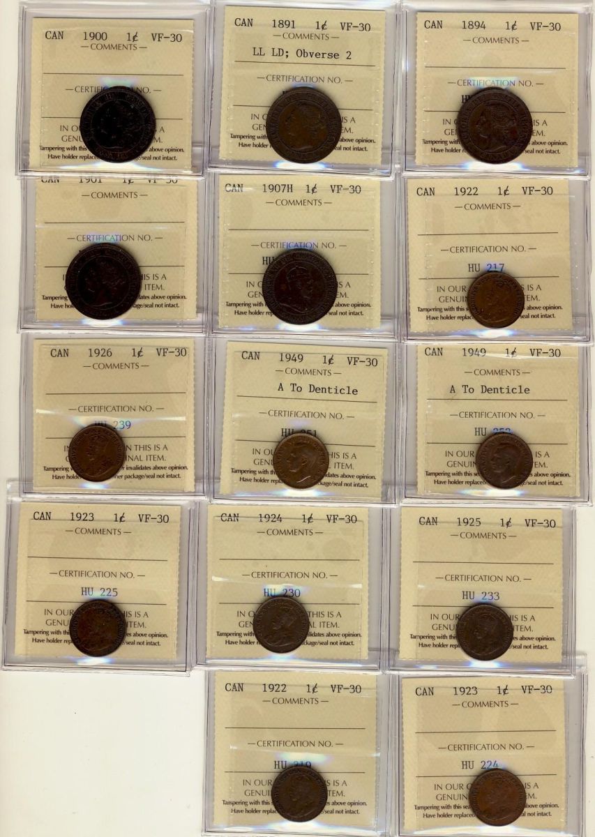 1894, 1891 LLLD Obv 2, 1900 & 1901, 1907H, 1922(2), 1923(2), 1924, 1925, 1926 & 1949 A to Dent(2) 1¢ ICCS VF30. Lot of 14 coins all nice examples. Including some better dates.