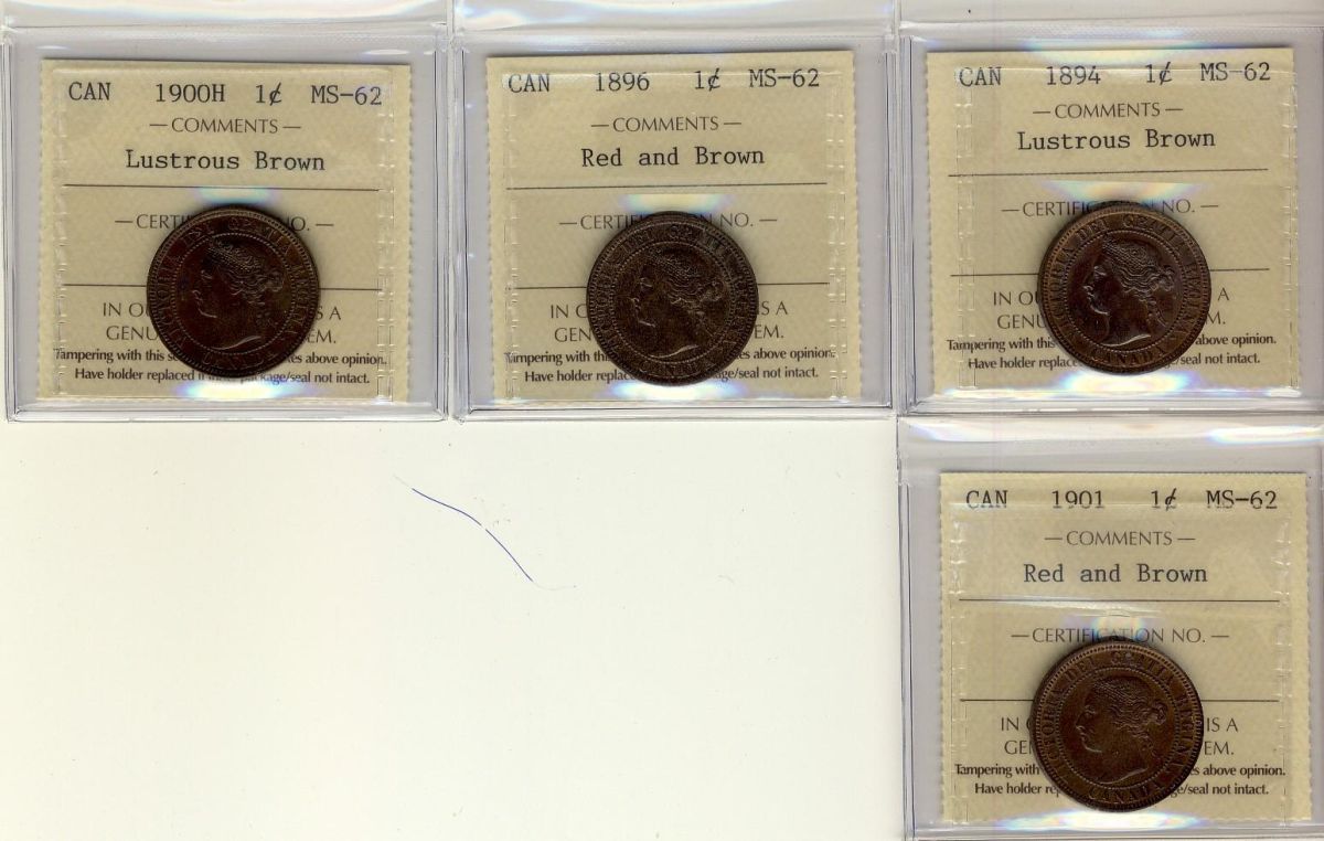1894, 1896, 1900H, 1901 1¢, all coins are ICCS MS-62