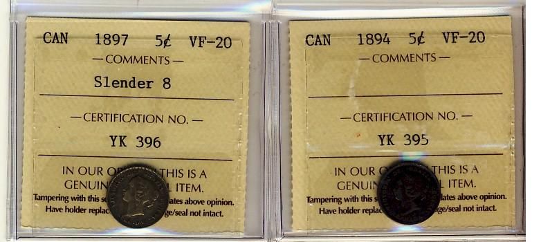 1894 & 1897 Slender 5¢ ICCS VF20. Lot of 2 coins.