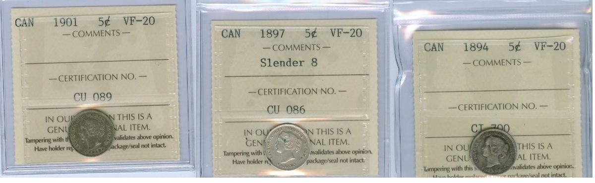 1894, 1897 Slender 8 and 1901 5¢. Lot of 3 ICCS graded coins, all VF20.