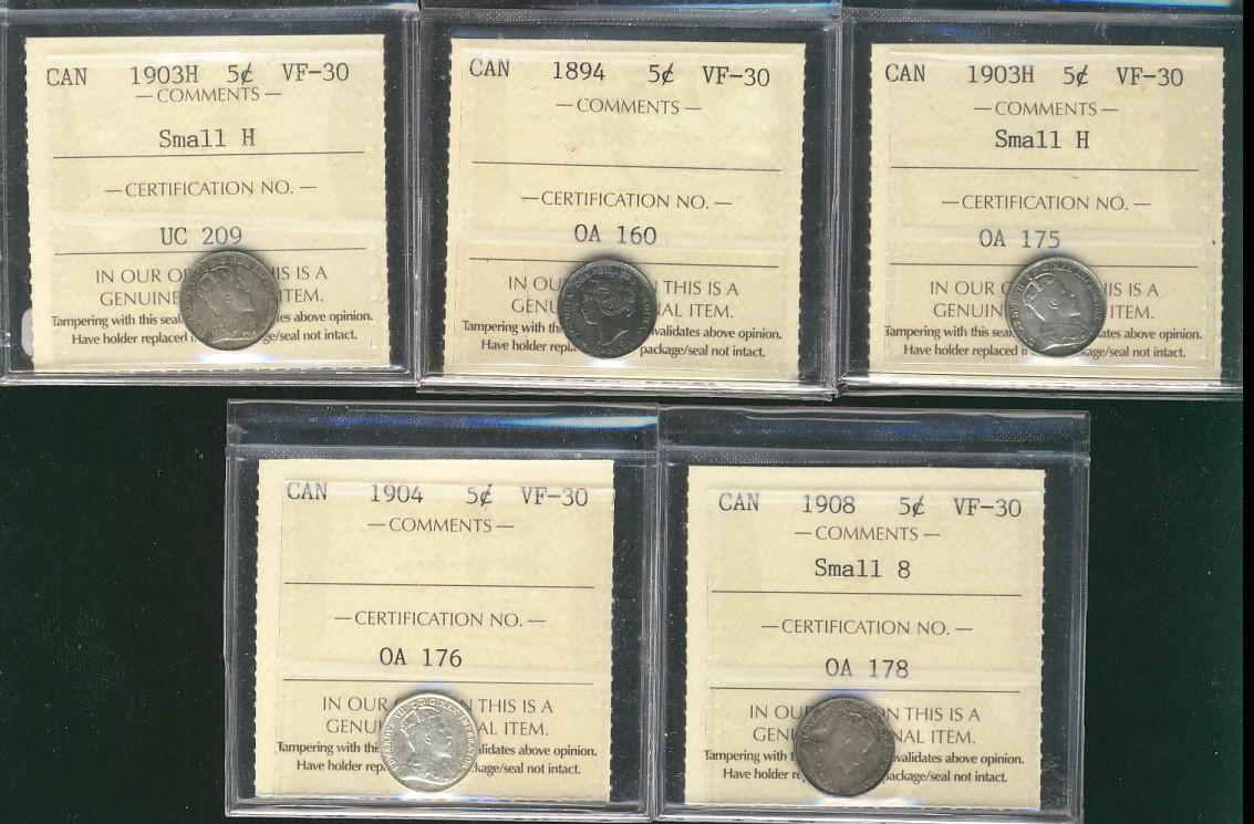 1894, 1903H Sml H(2), 1904 & 1908 Sml 8 5¢ ICCS VF30. Lot of 5 coins.
