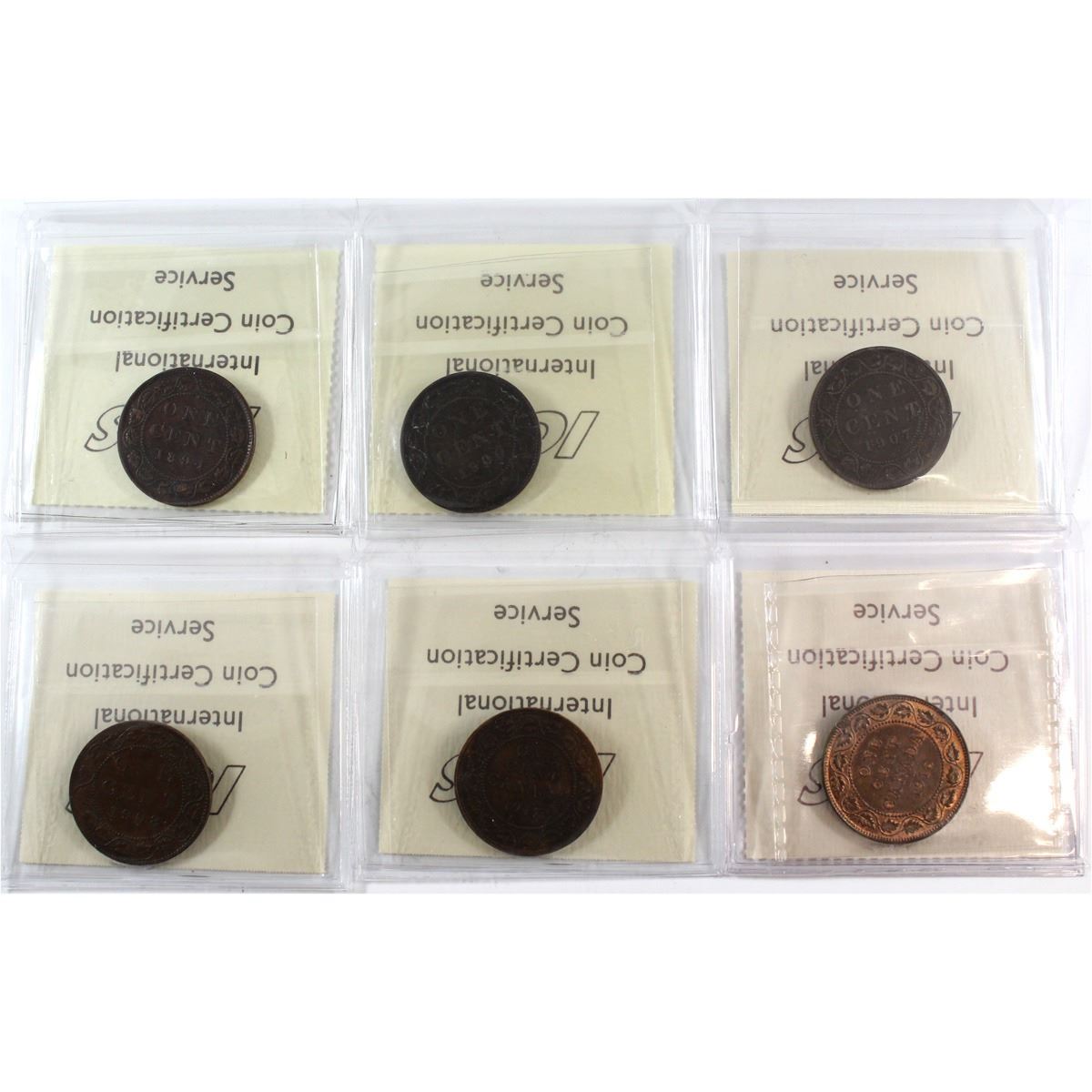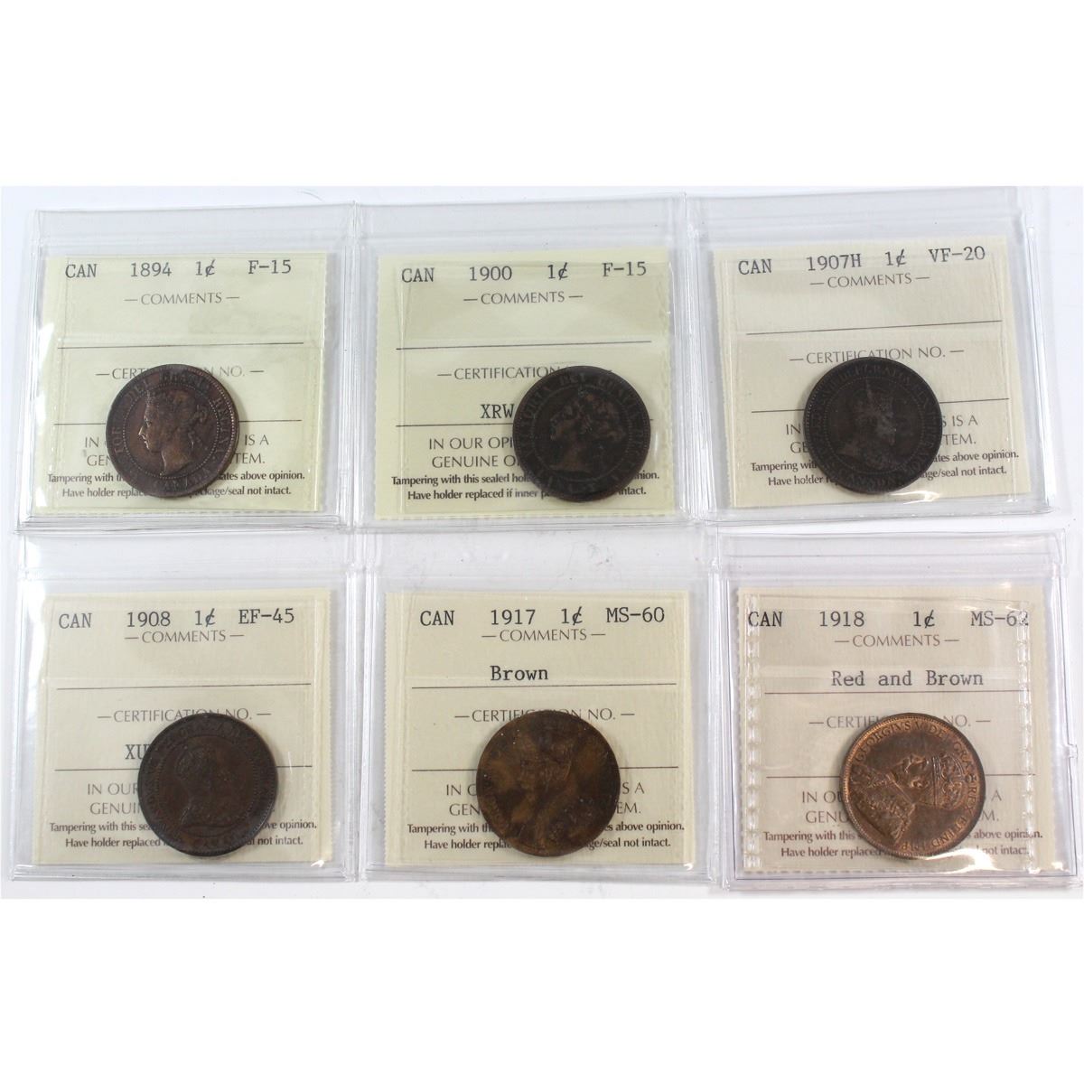 1894-1918 Canada 1-cent ICCS Certified - 1894 F-15, 1900 F-15, 1907H VF-20, 1908 EF-45, 1917 MS-60 Brown & 1918 MS-62 Red Brown. 6pcs