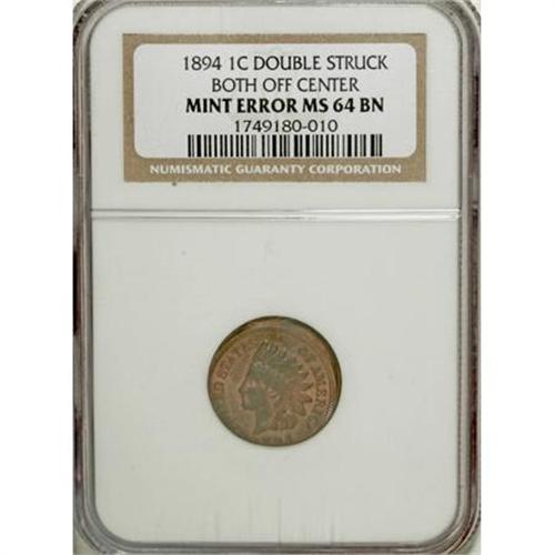 <B>1894 1C Indian Cent--Double Struck, Both Off Center--MS64 Brown NGC.</B></I> The first strike is approximately 7% off center toward 6:30. The second strike is 90% off center toward 12:30, at 11:30 relative to the first strike. This lustrous cent is about evenly divided into medium brown and rose-gold. The surfaces are smooth, and the strike is precise except for the denticles near the unstruck portion.<BR><BR><B>Coin Engraver:</B> James B. Longacre<BR><BR><b>Shipping:</b> Coins & Currency (<a target="_blank" href="http://www.heritageauctions.com/common/shipping.php">view shipping information</a>)