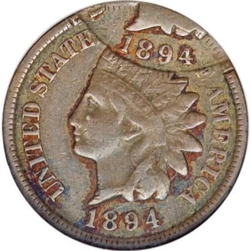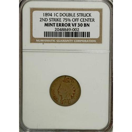 <B>1894 1C Indian Cent--Double Struck, 2nd Strike 75% Off Center--VF30 NGC.</B></I><BR> Both dates are bold on this double struck Indian cent. The second strike is far off center toward 11:30, and is present at 12:30 relative to the first strike. A cream-gray mint error with orange-red toning in protected areas. Each side has one or two brief peripheral marks.<BR><BR><B>Coin Engraver:</B> James B. Longacre<BR><BR><b>Shipping:</b> Coins & Currency (<a target="_blank" href="http://www.heritageauctions.com/common/shipping.php">view shipping information</a>)