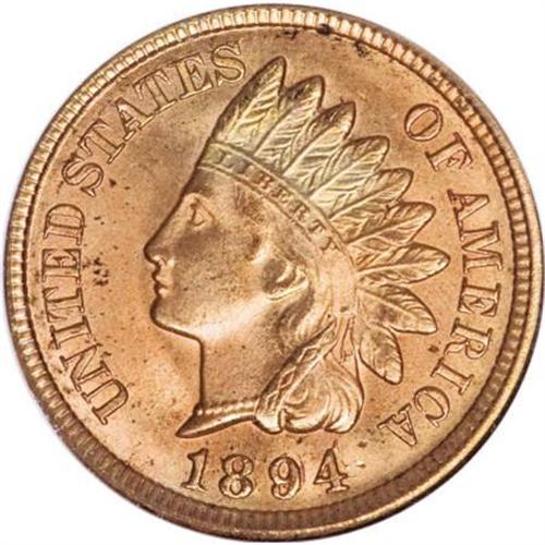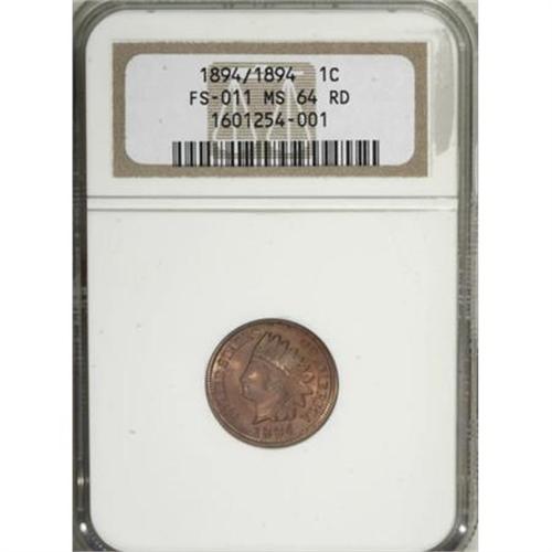 <B>1894 1C Doubled Date MS64 Red NGC.</B></I> FS-011. The doubling on this issue is more pronounced than any coin we can think of. All four digits are affected and the doubling is pivoted from just to the right of the 1 to markedly northeast of the top of the 4. The surfaces are rich red with a touch of olive over the top of the headdress. Surely a Gem were it not for the trace of a fingerprint on the reverse. Census: 7 in 64, 6 finer (1/08).<BR><BR><B>Coin Engraver:</B> James B. Longacre<BR><BR><b>Shipping:</b> Coins & Currency (<a target="_blank" href="http://www.heritageauctions.com/common/shipping.php">view shipping information</a>)