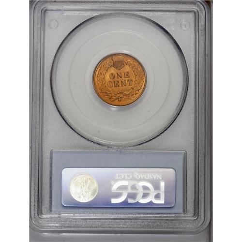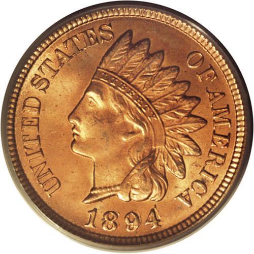 <B>1894<1C> Doubled Date MS64 Red PCGS.</B></I> Breen-2024, Snow-1, FS-011. The date was initially entered with the 94 higher than the 18. As a result, the first 1 and 8 are about level with the second punches, the first 9 is slightly higher than the second 9, and the first 4 is dramatically higher than the second 4. This variety was not widely known, but it is now listed in the <I>Guide Book,</B></I> and with its spectacular repunching, it "certainly is the 'king' of repunched dates among Indian cents," according to Bowers. Larry R. Steve and Kevin Flynn list it as No. 4 among the Top 20 most popular Indian cent varieties. The present example has brilliant, mellow sunset-orange surfaces on each side, with a few scattered flecks on each side seen under a loupe. Population: 10 in 64 Red, 11 finer (7/06).