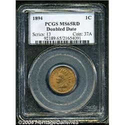 <B>1894<1C> Doubled Date MS65 Red PCGS.</B></I> FS-011, Snow-1, Breen-2024. In his 1992 reference on the series, Rick Snow states that the 1894 Doubled Die Cent is "scarce in low grades, rare to very rare in mint state." This is one of the finer examples we have handled of this popular, boldly doubled date. The surfaces have rich medium to darker red mint luster and there is slight striking softness, as usually seen on this issue. Very rare in Gem condition and always an expensive item when available at public auction. Population: 9 in 65, 0 finer (9/04). <BR><BR><B>Important notice:</B> Heritage usually auctions material at the rate of 200-250 lots per hour. On some occasions eBay Live bid software or the Internet may not be able to keep up with the pace of the auction. We recommend placing a realistic absentee bid now as insurance to avoid disappointment. Occasionally the auctioneer may eliminate or reject an eBay Live bid, and the auctioneer may also reopen a lot after the close of the eBay live bidding (usually because we missed an audience bid), and may reject your bid even if it shows you as the winning bidder. By bidding via eBay Live, you agree that Heritage may award the lot to another bidder at its sole discretion under the circumstances described above or any other reasonable circumstances. Since eBay bids are not shown to us until we open the lot on the floor, we treat those bids just like floor bids. In most cases the floor responds before the eBay bid is presented to us, due to Internet lag time, so for consistency we have made it a policy that floor bids are always considered first over tie eBay live bids. Also please note that all Heritage lots purchased through eBay Live carry a 20% Buyer's Premium. Please make sure you read the Terms and Conditions before you bid.