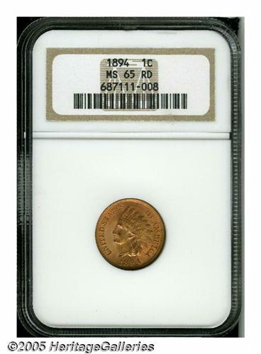 <B>1894<1C> MS65 Red NGC.</B></I> The exceedingly bright, lustrous surfaces display luscious red-orange and mint-green coloration, and have a few carbon spots and flyspecks, but are well preserved otherwise, and seem blemish-free on both sides. Population: 29 in 65, 9 finer (3/05).