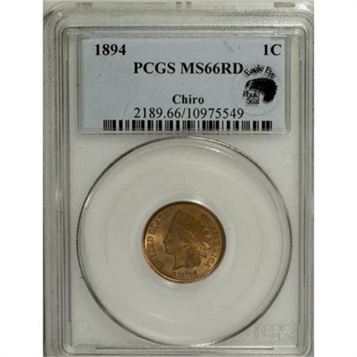 <B>1894 1C MS66 Red PCGS.</B></I> Eagle Eye Photo Seal, card included. Ex: Chiro. Satiny with intricate detailing in virtually all areas. Attractive rose and orange accents are seen intermittently on the reverse. The 1894 has gained appreciation as the most difficult Indian cent issue from the decade, a ranking it relinquishes only in better Mint State grades. Population: 22 in 66, 0 finer (7/07).<BR><BR><I>From The Santa Fe Collection.</B></I><BR><BR><B>Coin Engraver:</B> James B. Longacre<BR><BR><b>Shipping:</b> Coins & Currency (<a target="_blank" href="http://www.heritageauctions.com/common/shipping.php">view shipping information</a>\)