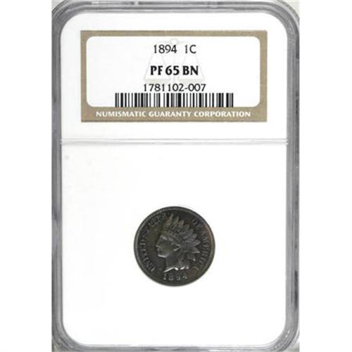 <B>1894 1C PR65 Brown NGC.</B></I> This specimen exhibits wonderful eye appeal, with attractive surfaces enhanced by areas of deep magenta and blue-green. A delightful later Indian proof. Census: 11 in 65 Brown, 5 finer (10/07).<BR><BR><B>Coin Engraver:</B> James B. Longacre<BR><BR><b>Shipping:</b> Coins & Currency (<a target="_blank" href="http://www.heritageauctions.com/common/shipping.php">view shipping information</a>)