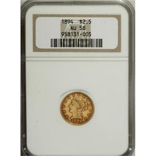<B>1894 $2 1/2 AU58 NGC.</B></I> NGC Census: (18/135). PCGS Population (26/121). Mintage: 4,000. Numismedia Wsl. Price for NGC/PCGS coin in AU58: $420. (#7846)<BR><BR><B>Coin Engraver:</B> Christian Gobrecht<BR><BR><b>Shipping:</b> Coins & Currency (<a target="_blank" href="http://www.heritageauctions.com/common/shipping.php">view shipping information</a>\)