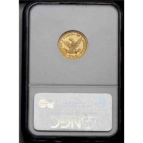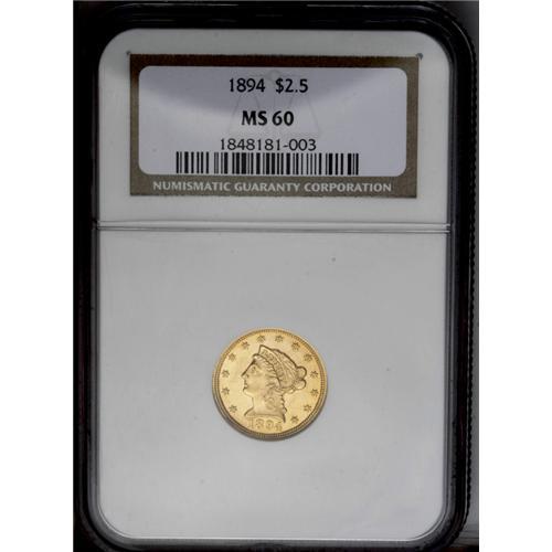 <B>1894<$2 1/2> MS60 NGC.</B></I> A highly lustrous coin with straw-orange surfaces and a magenta spot on the eagle's left (facing) claw. The devices show great detail, although tiny pinscratches and other marks in the fields suppress the grade.