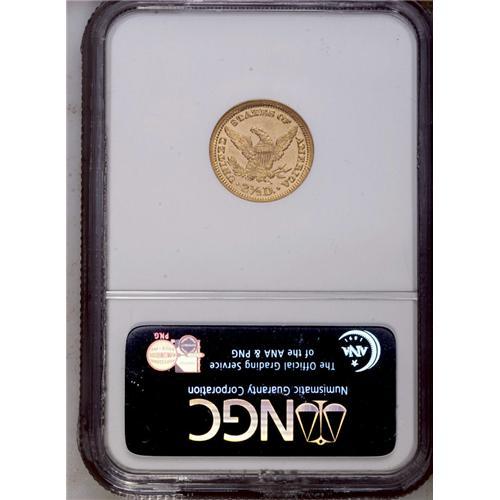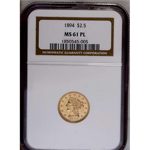 <B>1894<$2 1/2> MS61 Prooflike NGC.</B></I> Well struck with plenty of prooflike flash in the fields, where some wispy hairlines are also noted. A rarity in high grades from a business strike mintage of just 4,000 coins.