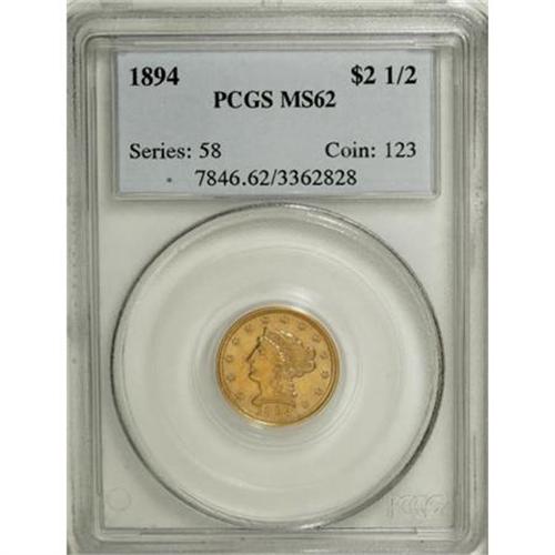 <B>1894 $2 1/2 MS62 PCGS.</B></I> PCGS Population (40/56). NGC Census: (32/64). Mintage: 4,000. Numismedia Wsl. Price for NGC/PCGS coin in MS62: $925. (#7846)<BR><BR><B>Coin Engraver:</B> Christian Gobrecht<BR><BR><b>Shipping:</b> Coins & Currency (<a target="_blank" href="http://www.heritageauctions.com/common/shipping.php">view shipping information</a>)