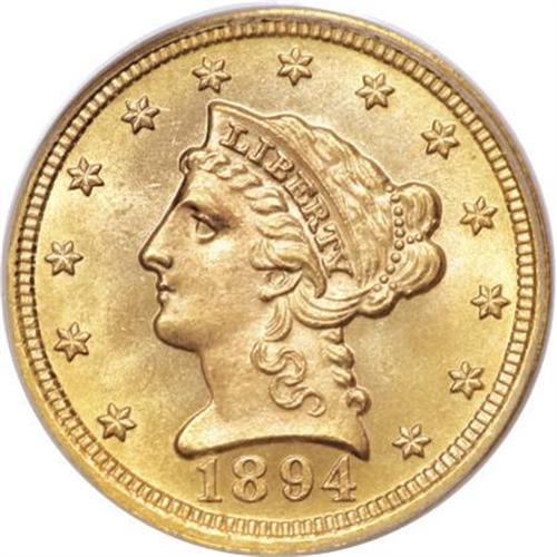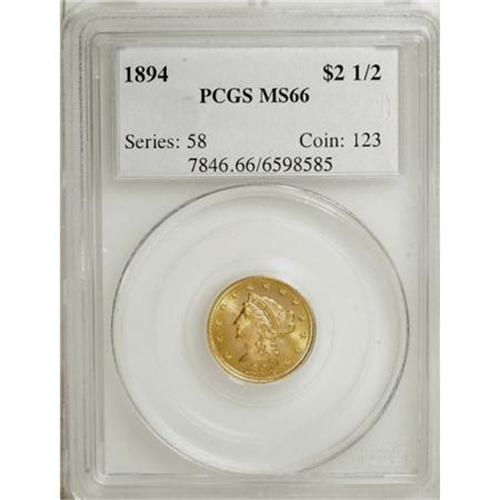 <B>1894 $2 1/2 MS66 PCGS.</B></I> By 1894, the quarter eagle as a denomination had achieved a sort of "lame duck" status. The San Francisco Mint, issuer of gold pieces for the one region of the country where gold was in domestic use, stopped producing the pieces in 1879. The Philadelphia Mint continued minting quarter eagles, but only in small quantities, and for 1894, circulation-strike production fell to just 4,000 pieces.<BR> The vibrant Premium Gem offered here is a beautifully preserved representative of this boutique issue. The boldly impressed, subtly frosted devices emerge from shining yellow-gold fields that show faint honey accents. Only a handful of minuscule marks appear in the obverse fields, and the reverse is simply exquisite. Population: 6 in 66, 5 finer (11/07).<BR><I>From The Parker Lee III Collection.</B></I><BR><BR><B>Coin Engraver:</B> Christian Gobrecht<BR><BR><b>Shipping:</b> Coins & Currency (<a target="_blank" href="http://www.heritageauctions.com/common/shipping.php">view shipping information</a>)