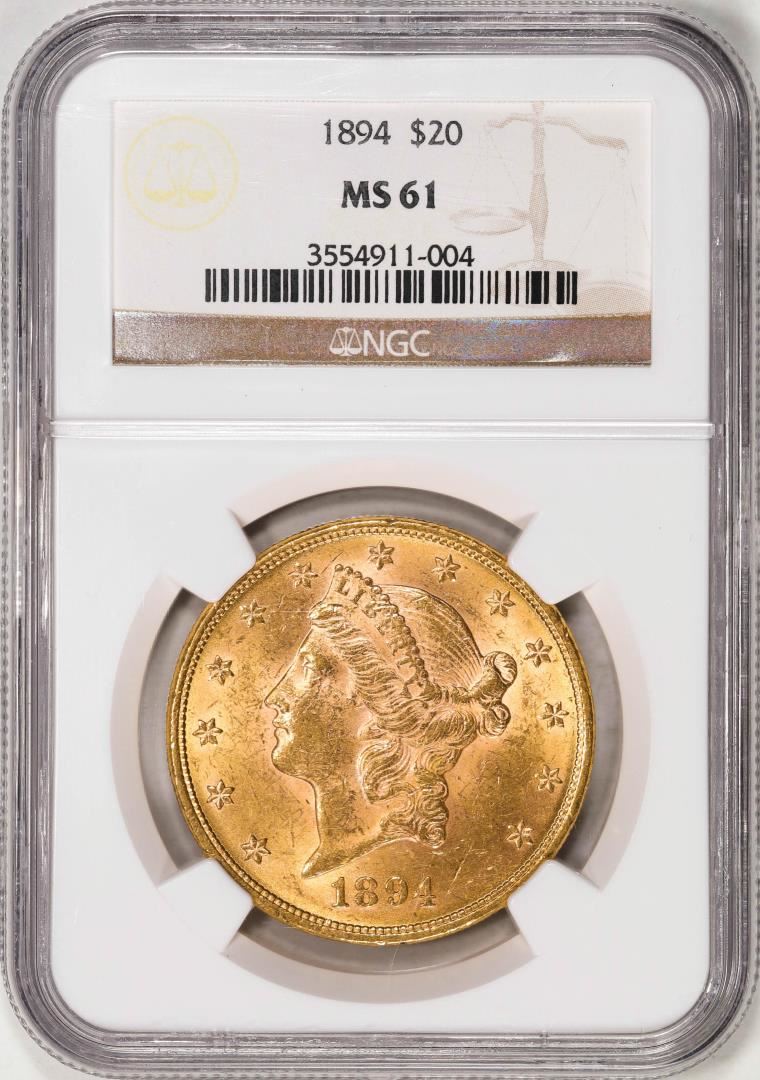 One 1894 $20 Liberty Head Double Eagle Gold Coin NGC MS61. NGC Certified.