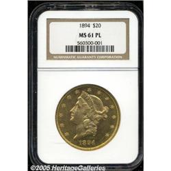 <B>1894 $20 MS61 Prooflike NGC.</B></I> A moderately mirrored peach-gold Liberty Twenty, well struck aside from slight softness on the central curls. Marks are distributed on the obverse field but none are particularly distracting. NGC Prooflike Population: 5 in 61, 2 finer (2/05).