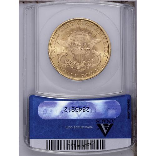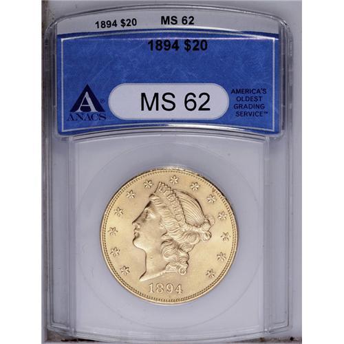 <B>1894<$20> MS62 ANACS.</B></I> Well struck, with bright honey-gold patination. Luster is strongest in the crevices of, and in the areas around, the design elements. Several light abrasions are scattered about, particularly over the obverse. <BR><BR><B>Important notice:</B> Heritage usually auctions material at the rate of 200-250 lots per hour. On some occasions eBay Live bid software or the Internet may not be able to keep up with the pace of the auction. We recommend placing a realistic absentee bid now as insurance to avoid disappointment. Occasionally the auctioneer may eliminate or reject an eBay Live bid, and the auctioneer may also reopen a lot after the close of the eBay live bidding (usually because we missed an audience bid), and may reject your bid even if it shows you as the winning bidder. By bidding via eBay Live, you agree that Heritage may award the lot to another bidder at its sole discretion under the circumstances described above or any other reasonable circumstances. Since eBay bids are not shown to us until we open the lot on the floor, we treat those bids just like floor bids. In most cases the floor responds before the eBay bid is presented to us, due to Internet lag time, so for consistency we have made it a policy that floor bids are always considered first over tie eBay live bids. Also please note that all Heritage lots purchased through eBay Live carry a 20% Buyer's Premium. Please make sure you read the Terms and Conditions before you bid. This lot is being auctioned in conjunction with a live floor auction by Heritage Galleries & Auctioneers. All final auction and invoice information will be supplied by Heritage Galleries & Auctioneers, and all other information should be considered preliminary. Lot:4350 <BR><BR><B>Winning Notification and Billing:</B> After the FINAL session in this auction is complete, Heritage will send e-mail and snail mail invoices. This process normally takes several days. All final auction and invoice information will be supplied by Heritage Galleries & Auctioneers, and all other information should be considered preliminary. <BR><BR>This auction will be conducted on a live auction floor and over the Internet through eBay Live. If you choose to place an absentee bid, please take a moment to <font color='#0000ff'><u><a href='http://pages.ebay.com/liveauctions/help/before/laabsentee.html'>learn how eBay Live absentee bidding works</a></u></font><font color='#000000'>