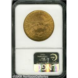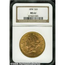 <B>1894 $20 MS62 NGC.</B></I> The design features are well struck, and peach-gold patina reveals touches of tan color. The luster is somewhat subdued in places, and light contact marks are scattered about, mostly noticeable on the obverse.