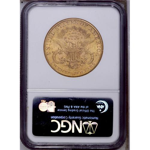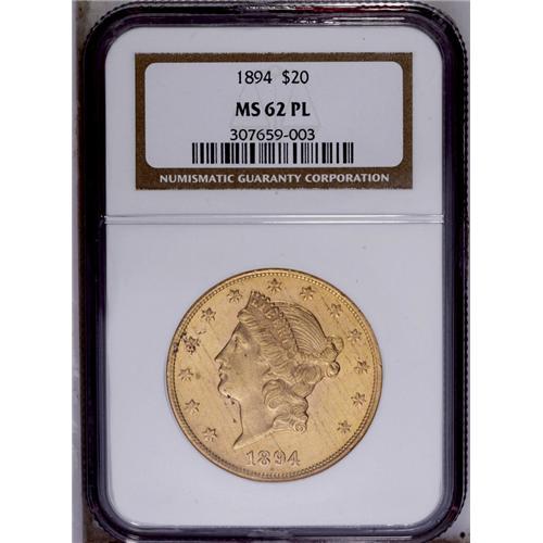<B>1894<$20> MS62 Prooflike NGC.</B></I> The apricot-gold fields are uncommonly reflective. The strike is bold if not complete on the hair curls between the ear and bun. A few specks of struck-in grease, as made, are located on the left obverse. Census: 2 in 62 Prooflike, 1 finer (3/06). <BR><BR><B>Important notice:</B> Heritage usually auctions material at the rate of 200-250 lots per hour. On some occasions eBay Live bid software or the Internet may not be able to keep up with the pace of the auction. We recommend placing a realistic absentee bid now as insurance to avoid disappointment. Occasionally the auctioneer may eliminate or reject an eBay Live bid, and the auctioneer may also reopen a lot after the close of the eBay live bidding (usually because we missed an audience bid), and may reject your bid even if it shows you as the winning bidder. By bidding via eBay Live, you agree that Heritage may award the lot to another bidder at its sole discretion under the circumstances described above or any other reasonable circumstances. Since eBay bids are not shown to us until we open the lot on the floor, we treat those bids just like floor bids. In most cases the floor responds before the eBay bid is presented to us, due to Internet lag time, so for consistency we have made it a policy that floor bids are always considered first over tie eBay live bids. Also please note that all Heritage lots purchased through eBay Live carry a 20% Buyer's Premium. Please make sure you read the Terms and Conditions before you bid. This lot is being auctioned in conjunction with a live floor auction by Heritage Galleries & Auctioneers. All final auction and invoice information will be supplied by Heritage Galleries & Auctioneers, and all other information should be considered preliminary. Lot:4355 <BR><BR><B>Winning Notification and Billing:</B> After the FINAL session in this auction is complete, Heritage will send e-mail and snail mail invoices. This process normally takes several days. All final auction and invoice information will be supplied by Heritage Galleries & Auctioneers, and all other information should be considered preliminary. <BR><BR>This auction will be conducted on a live auction floor and over the Internet through eBay Live. If you choose to place an absentee bid, please take a moment to <font color='#0000ff'><u><a href='http://pages.ebay.com/liveauctions/help/before/laabsentee.html'>learn how eBay Live absentee bidding works</a></u></font><font color='#000000'>