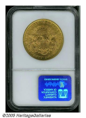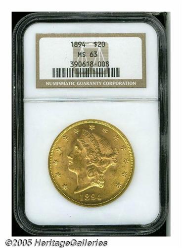 <B>1894<$20> MS63 NGC.</B></I> A lovely type coin with a good strike and pleasing apricot-tinged cartwheel luster. Light marks are evident but do not distract for the grade.