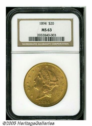 <B>1894<$20> MS63 NGC.</B></I> Well struck with exceedingly bright, full luster, bewitching pink and green coloration, and moderately abraded surfaces, for the grade.<BR><I>From the Dr. Kurt Peters Collection.</B></I> From the Dr. Kurt Peters Collection.