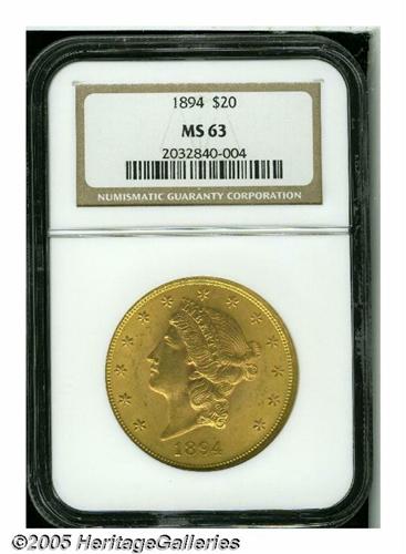 <B>1894<$20> MS63 NGC.</B></I> Well struck with pleasing satiny luster and attractive pastel shades of pink and green-gold over obverse and reverse. A few mild grazes and minor contact marks limit the grade.<BR><I>From the Dr. Kurt Peters Collection.</B></I> From the Dr. Kurt Peters Collection.
