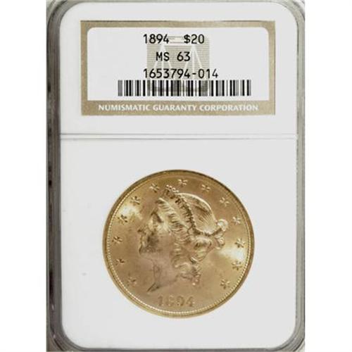 <B>1894 $20 MS63 NGC.</B></I> NGC Census: (1115/129). PCGS Population (853/87). Mintage: 1,368,990. Numismedia Wsl. Price for NGC/PCGS coin in MS63: $1,400. (#9025)<BR><BR><B>Coin Engraver:</B> James B. Longacre<BR><BR><b>Shipping:</b> Coins & Currency (<a target="_blank" href="http://www.heritageauctions.com/common/shipping.php">view shipping information</a>)