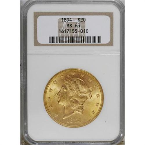 <B>1894 $20 MS63 NGC.</B></I> Crisply detailed with light haze over highly lustrous yellow-orange surfaces. Light, scattered flaws are present on the portrait, though the fields are comparatively clean.<BR><BR><B>Coin Engraver:</B> James B. Longacre<BR><BR><b>Shipping:</b> Coins & Currency (<a target="_blank" href="http://www.heritageauctions.com/common/shipping.php">view shipping information</a>)