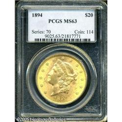 <B>1894 $20 MS63 PCGS.</B></I> Fully brilliant with frosty apricot-gold luster. The surfaces are exceptional pleasing, and the eye appeal is wonderful. Lot:9241