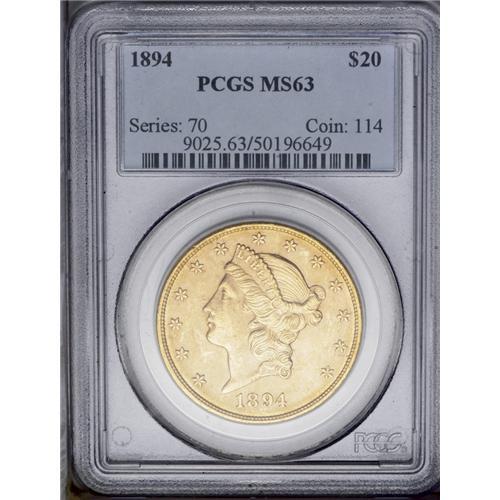 <B>1894<$20> MS63 PCGS.</B></I> Intensely lustrous with alluring peach-gold and ice-green coloration over both sides. Sharply struck with typical abrasions for the grade. Relatively common at this grade level, but very scarce any finer.